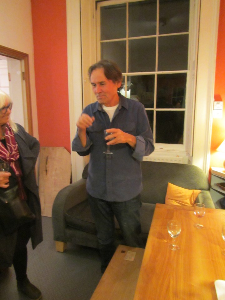 Charles explaining his finishing methods, drink in hand