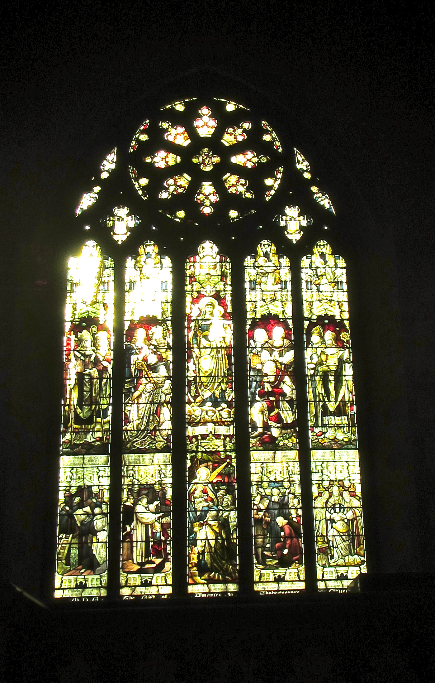 The “American Window,” a gift from the American ambassador in 1896. The lowest panels depict the Pilgrims landing in Massachusetts.