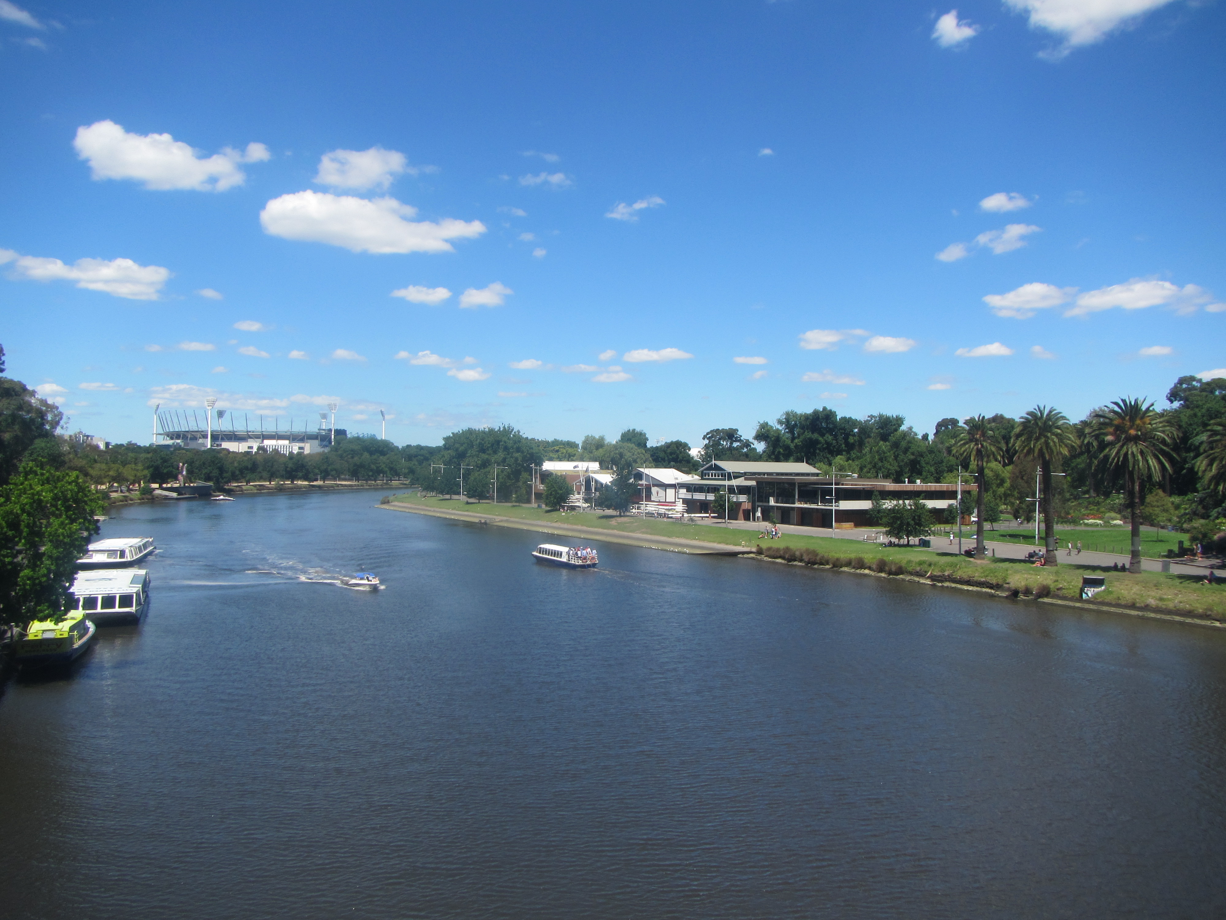 IMG_5645 ← Previous Next → Looking down the Yarra from Prince’s Bridge. This is the Sports Precinct, immediately next to Arts and Federation Square and a couple of gorgeous parks. The cricket ground to the right and the stadium beyond.